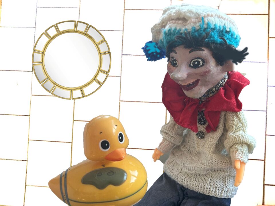 Kasperl findet in der hintersten Ecke vom Flohmarkt eine Badeente.